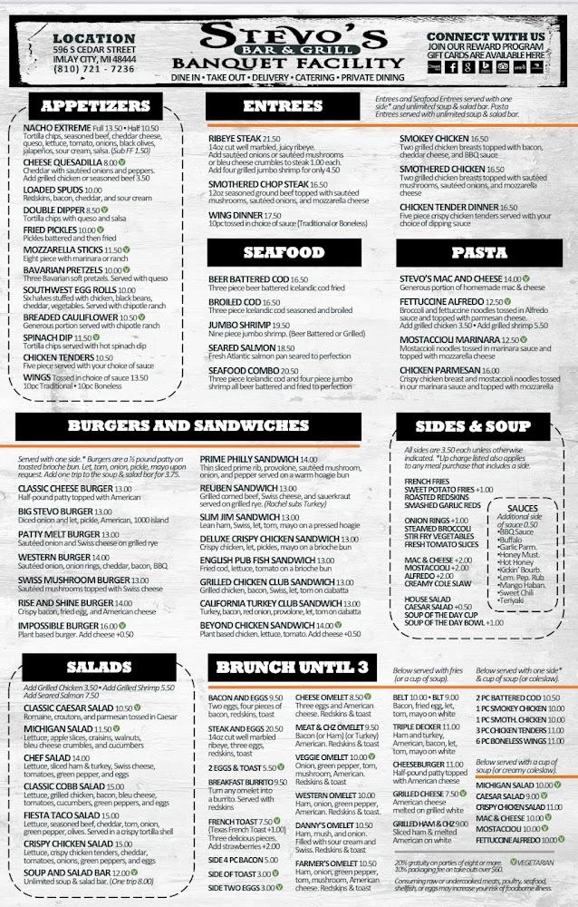 The menu at Stevo's is a blend of traditional and modern American dishes. Explore hearty burgers, fresh seafood, and comfort food classics. The fettuccine alfredo is popular among diners looking for rich flavors. Appetizers and daily specials cater to a wide range of tastes. It's a place designed for sharing good food with family and friends. Don't forget dessert; it's a sweet way to end the meal!