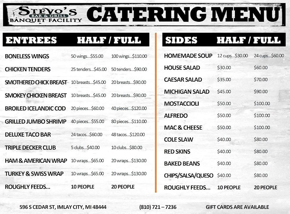 Welcome to Stevo's Bar & Grill Banquet Facility, your premier destination for dining and events in Imlay City! Owned by the experienced duo Danny and Renee Djurovski, we proudly offer over 70 years of restaurant expertise. Conveniently located just north of I-69 off M-53, our vibrant bar and grill serves delicious meals six days a week, while our spacious banquet facility can comfortably host gatherings of up to 120 guests. Whether planning a wedding, corporate event, or family celebration, our dedicated team ensures your experience is unforgettable. Join us for great food, friendly service, and memorable moments!